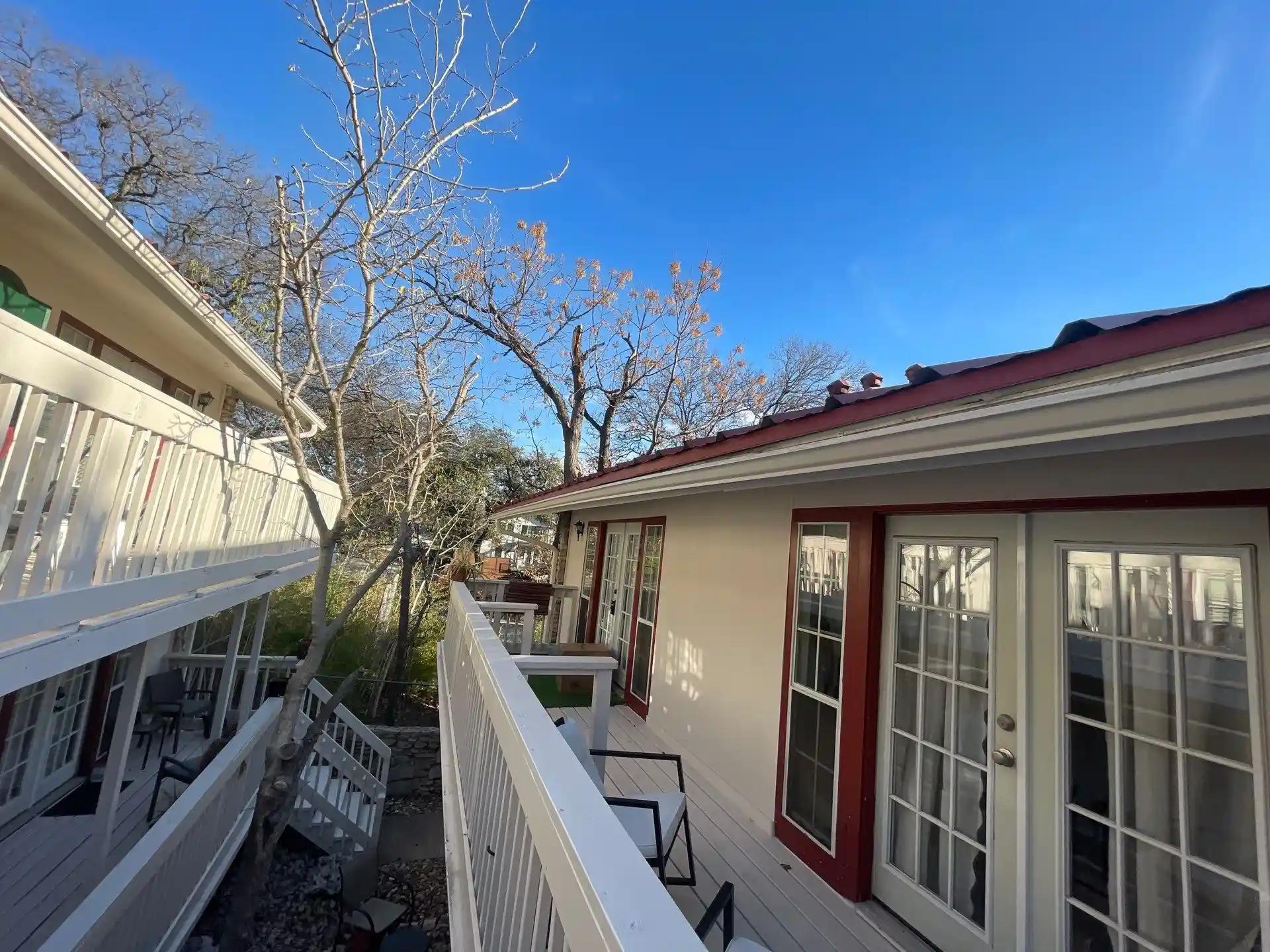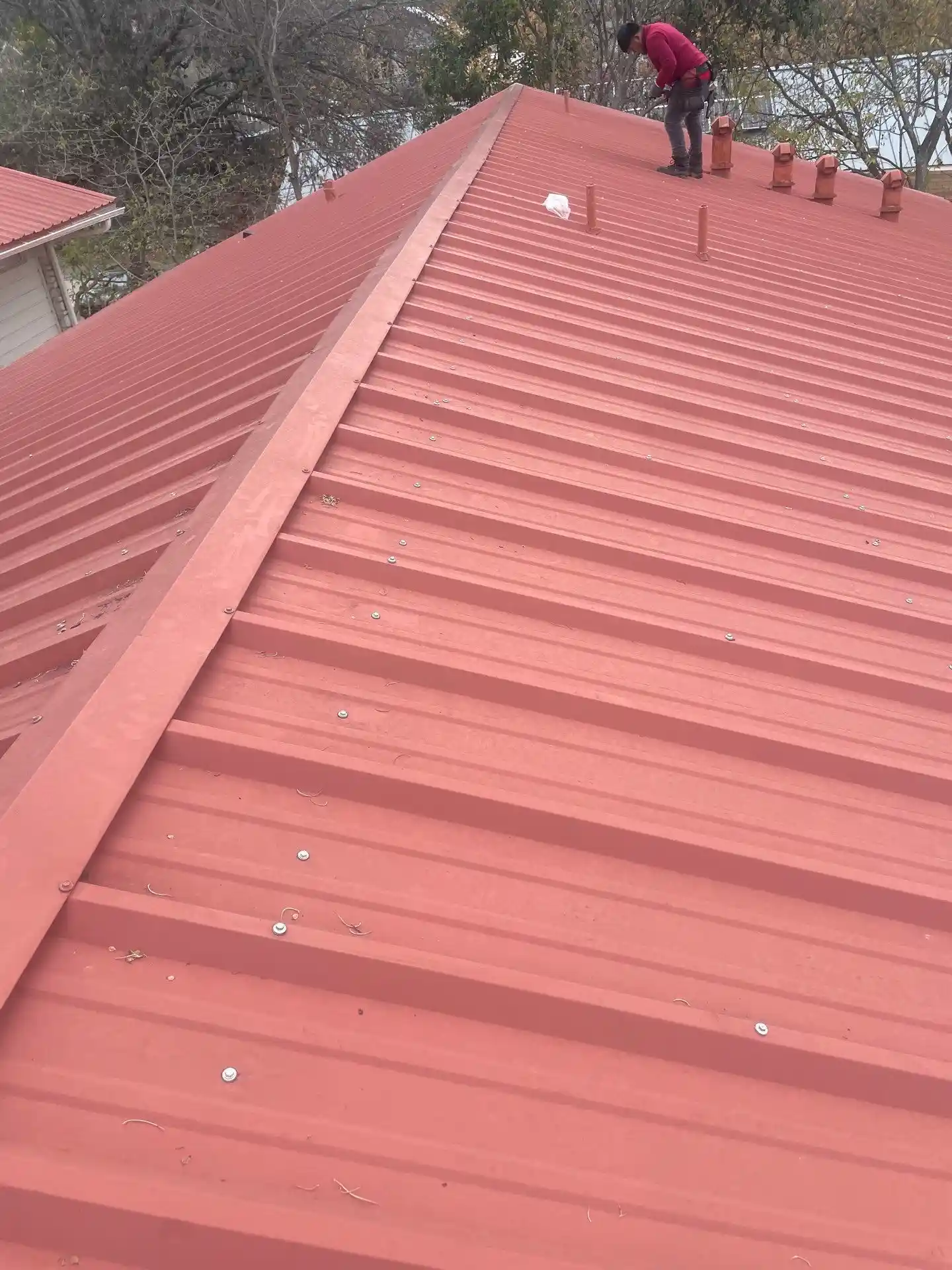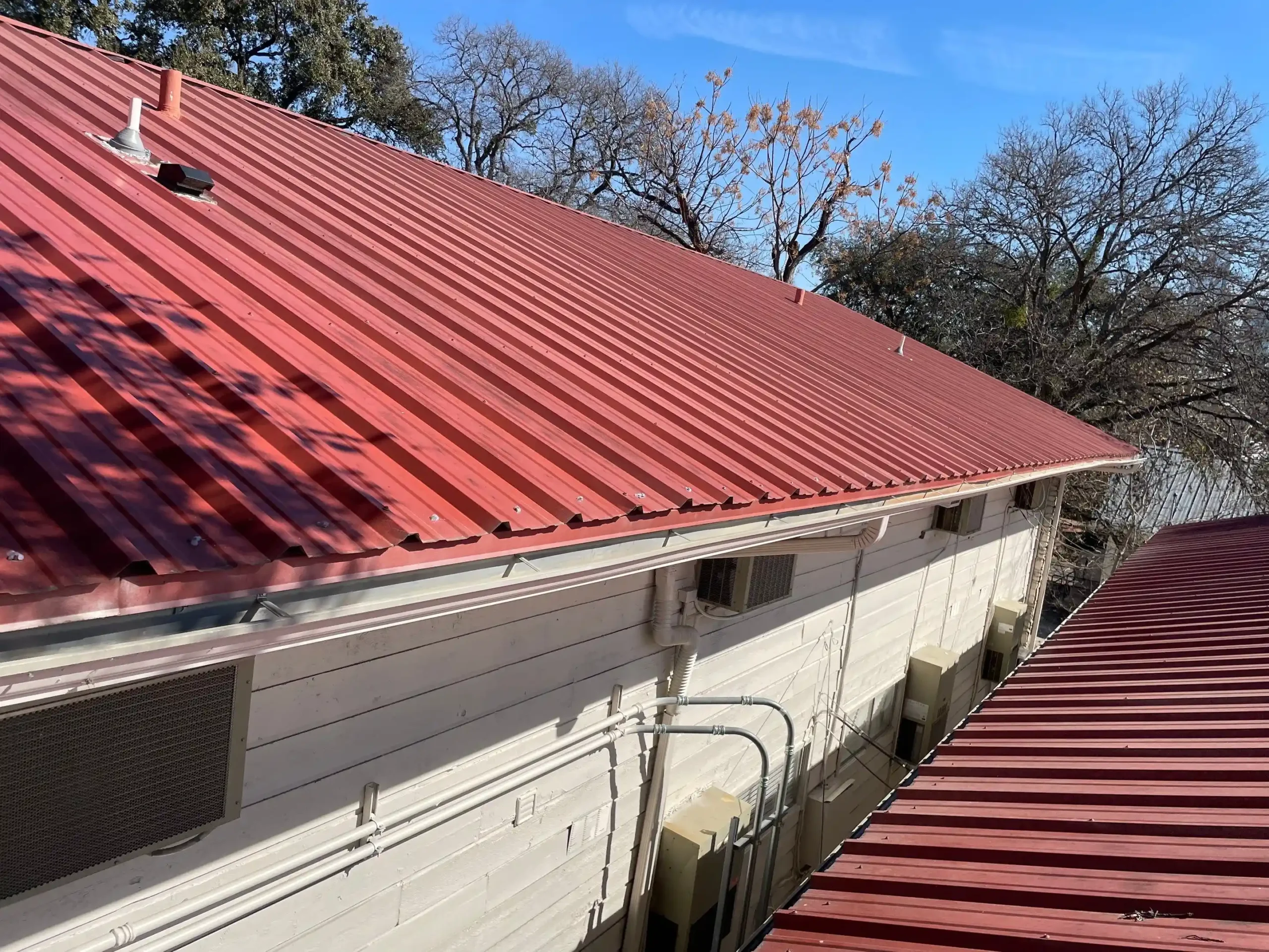 We completed a thorough 26 to 28 gauge metal roof repair project across three condominium buildings in Austin, TX, ensuring long-term performance and leak protection for the community. Our team cleaned and cleared all gutters and downspouts, secured drip-edge metal, replaced loose fasteners, and resealed flashings and plumbing stacks. We also reviewed and tightened ridge caps, replaced non-metal vents, and sealed end-cap gaps to prevent future water intrusion. Every building was inspected for active leaks before repairs began, ensuring accurate, effective restoration and improved roof durability.